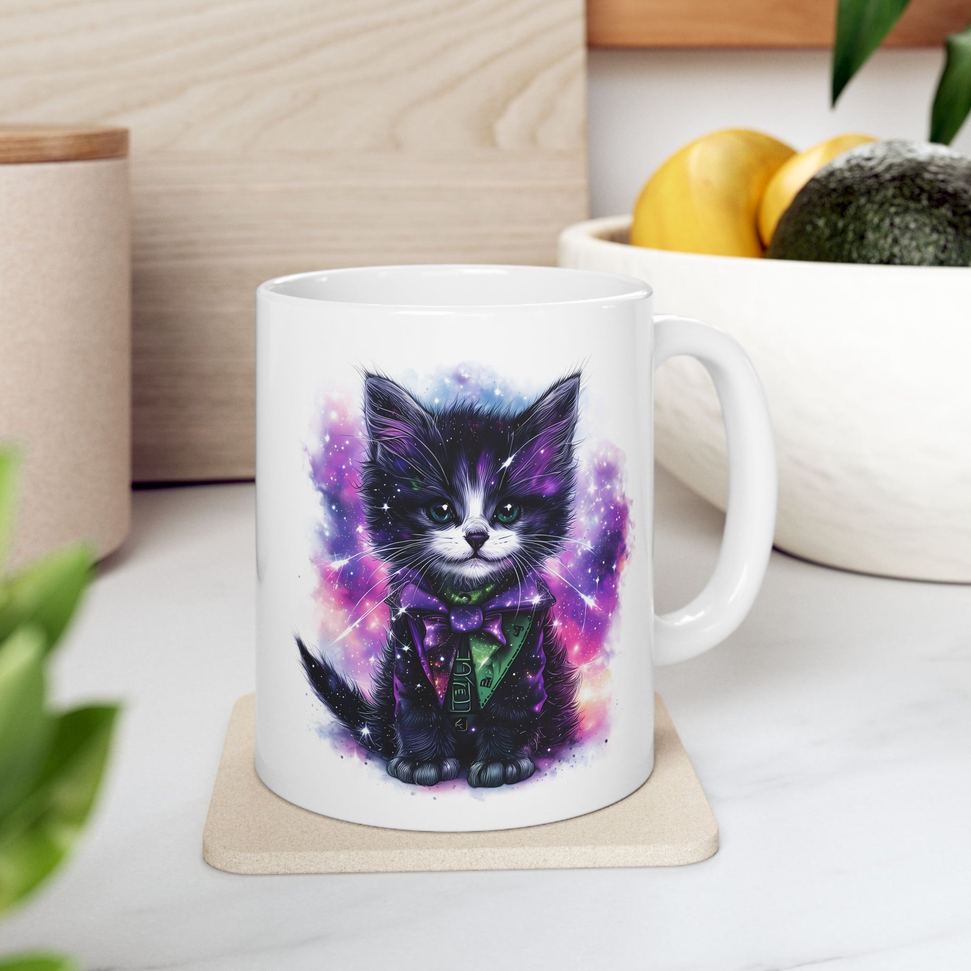 Sip among the stars with this glossy ceramic mug featuring a midnight-black kitten cloaked in swirling nebula purples, blues and pinks, complete with a cosmic bow-tie and emerald sash.